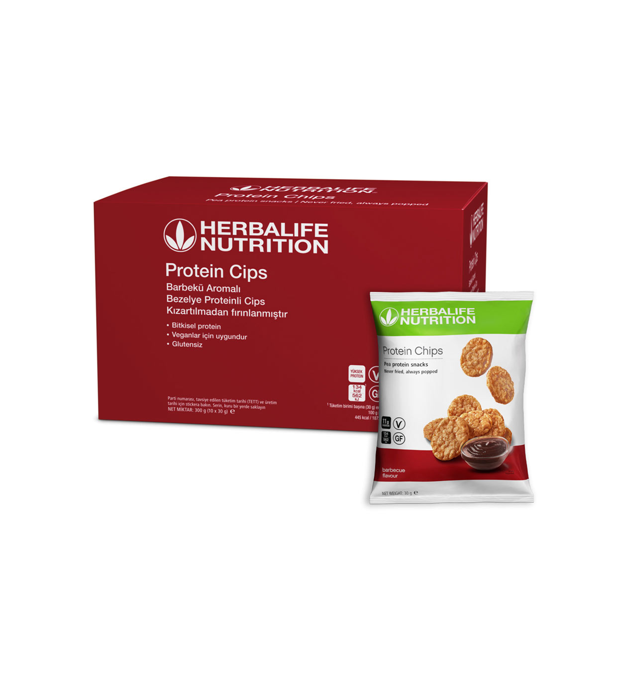 Barbekü Aromalı Protein cipslerin her paketi, 11g bitki bazlı bezelye proteini içerir ve veganlar için uygundur. Protein Cipsler iki aromada mevcuttur ve glutensizdir.