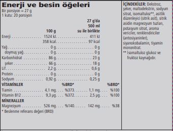*2 ölçü kaşığı (27g) ürünün 500 ml su ile karıştırılmasıyla elde edilen karbonhidrat ve elektrolit içeren bu spor içeceği,